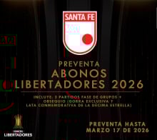 ABONOS SANTA FE COPA LIBERTADORES 2026 Estadio El Campín Bogotá Desde 8 Feb Dom 8 Feb Hasta 17 Mar Mar 17 Mar ABONOS SANTA FE COPA LIBERTADORES 2026 Bogotá 9 Feb Lun