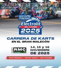 GRAN PREMIO ELECTROLIT DEL CARIBE 2025 Malecón - Calle 72 BARRANQUILLA Desde 14 Nov Vie 14 Nov Hasta 16 Nov Dom 16 Nov GRAN PREMIO ELECTROLIT DEL CARIBE 2025 BARRANQUILLA 8 Nov Sáb