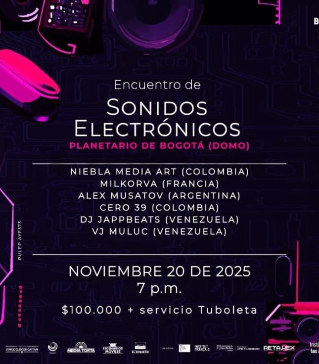 Bogotá: La gira | Andrés Cepeda | Santa Marta Teatro Santa Marta - Cl. 16 #5 - 10 Santa Marta 19 Nov Mié 19 Nov Vaner Stiv Álvarez (Colombia), percusión sinfónica Sala de Conciertos de la Biblioteca Luis Ángel Arango Bogota 20 Nov Jue 20 Nov MELENDI | 20 AÑOS TOUR Movistar Arena Bogotá 20 Nov Jue 20 Nov Laura Maré en Concierto Teatro Astor Plaza Bogotá 20 Nov Jue 20 Nov ENCUENTRO DE SONIDOS ELECTRÓNICOS PLANETARIO Planetario de Bogotá Bogota 20 Nov Jue 20 Nov Chamber Music Society of Lincoln Center, Estados Unidos Teatro Estudio - Julio Mario Santo Domingo Bogotá 21 Nov Vie 21 Nov Ballet Preljocaj, Francia - 'Gravity' Teatro Mayor Julio Mario Santo Domingo Bogotá Desde 21 Nov Vie 21 Nov Hasta 22 Nov Sáb 22 Nov Mostrar más eventos