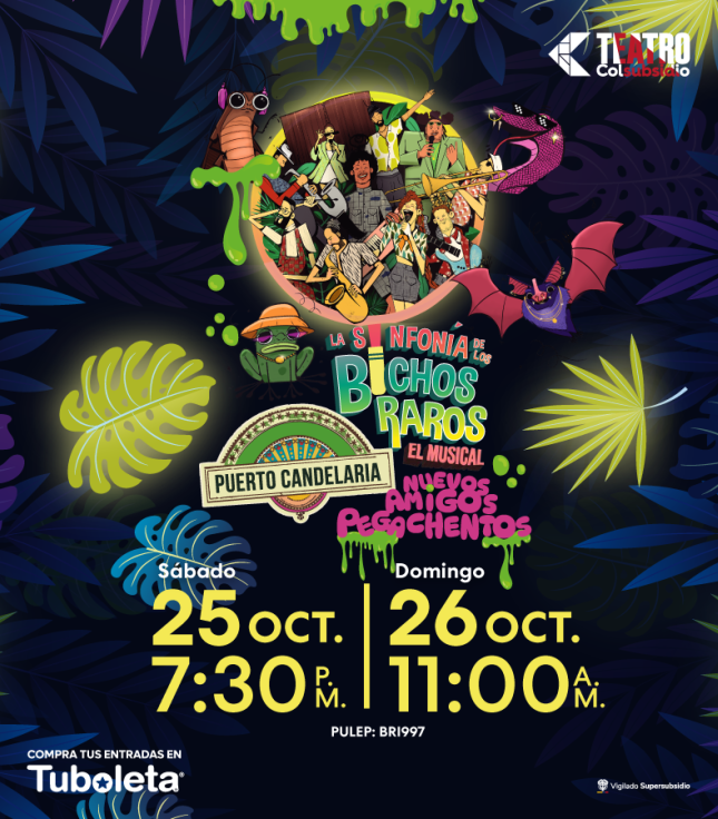 La Sinfonía de los Bichos Raros – Nuevos amigos pegachentos Teatro Colsubsidio Bogotá Desde 25 Oct Sáb 25 Oct Hasta 26 Oct Dom 26 Oct