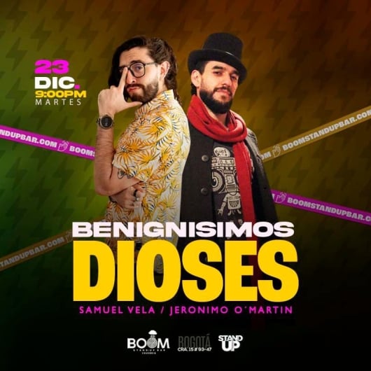 Destacados Ila, La Niña Tejedora Teatro El Parque Bogotá 21 Dic Dom 21 Dic EL CASCANUECES - BUCARAMANGA Teatro Santander Bucaramanga 21 Dic Dom 21 Dic BENIGNISIMOS DIOSES - (DIC) Boom Stand Up Bar - Bogotá Bogotá 23 Dic Mar 23 Dic CORRECCION DE ESTILO - DIEGO MARTINEZ (DIC) Boom Stand Up Bar - Bogotá Bogotá 26 Dic Vie 26 Dic EL QUE INVENTO LA NAVIDAD NO ESTABA SOLO - MEDELLÍN BOOM STAND UP BAR - Cl. 26 #43g-30 BARRIO COLOMBIA Medellín 26 Dic Vie 26 Dic ESTA NAVIDAD NO ES MIA - MEDELLÍN BOOM STAND UP BAR - Cl. 26 #43g-30 BARRIO COLOMBIA Medellín 27 Dic Sáb 27 Dic NOCHE DE SETCITOS Boom Stand Up Bar - Bogotá Bogotá 27 Dic Sáb 27 Dic Mostrar más eventos Movistar Arena Dg. 61c #26-36, Teusaquillo Teatro Julio Mario Santodomingo Cl. 170 #67-51 Teatro Colsubsidio Av. El Dorado #25-40, Bogotá Maloka Centro Interactivo Maloka, Cra. 68d #24A - 51 Teatro CAFAM Ak 68 #90 - 88 Centro Nacional de las Artes Cl. 11 #5 - 60 Teatro Metropolitano Cl. 41 # 57 - 30, La Candelaria, Medellín. Teatro El Tesoro Carrera 25A # 1A Sur - 45 Medellín. Teatro El Ensueño Tv. 70 D #60-90, Sur, Bogotá Teatro Jorge Eliécer Gaitán Cra. 7 #22-47, Santa Fé, Bogotá. Teatro La Concha Calle 4 #10-48, Cali