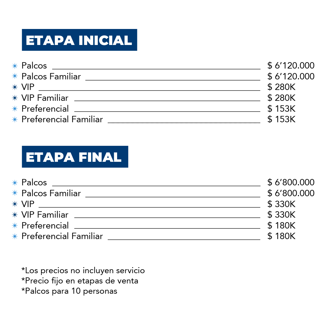 | Palcos Familiar* | $680.000 + $92.300 | 180 |