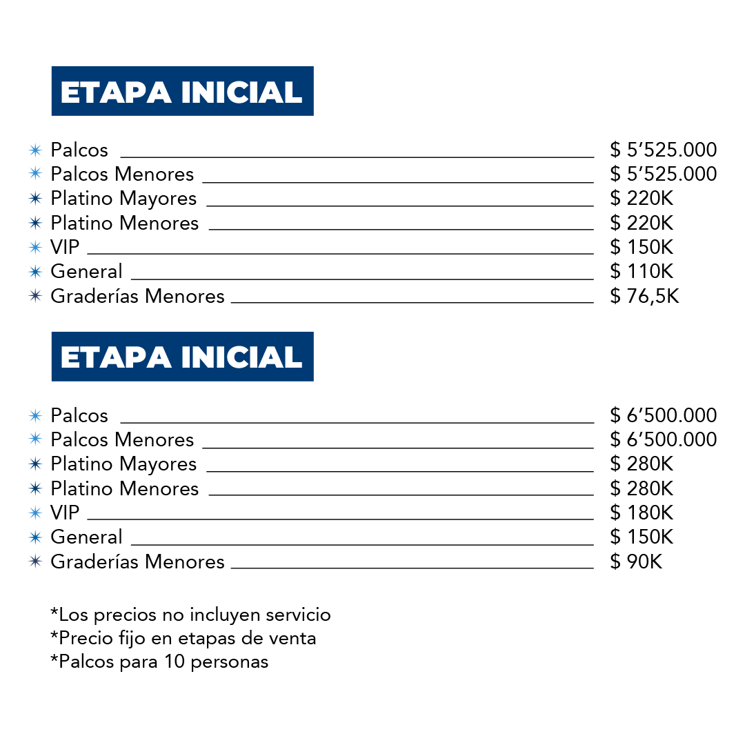 | Palco 1* | $552.500 + $75.700 | 30 |