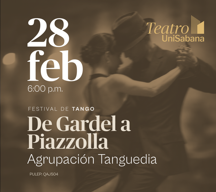 “De Gardel a Piazzolla” El tango en sus tres grandes manifestaciones: danza, canto y tango instrumental, se hará presente con repertorio que incluye obras desde Carlos Gardel hasta Astor Piazzolla, pasando por exponentes como Cacho Castaña, y los clásicos como Aníbal Trolio, Santos di Cepolo y Enrique Cadícamo.