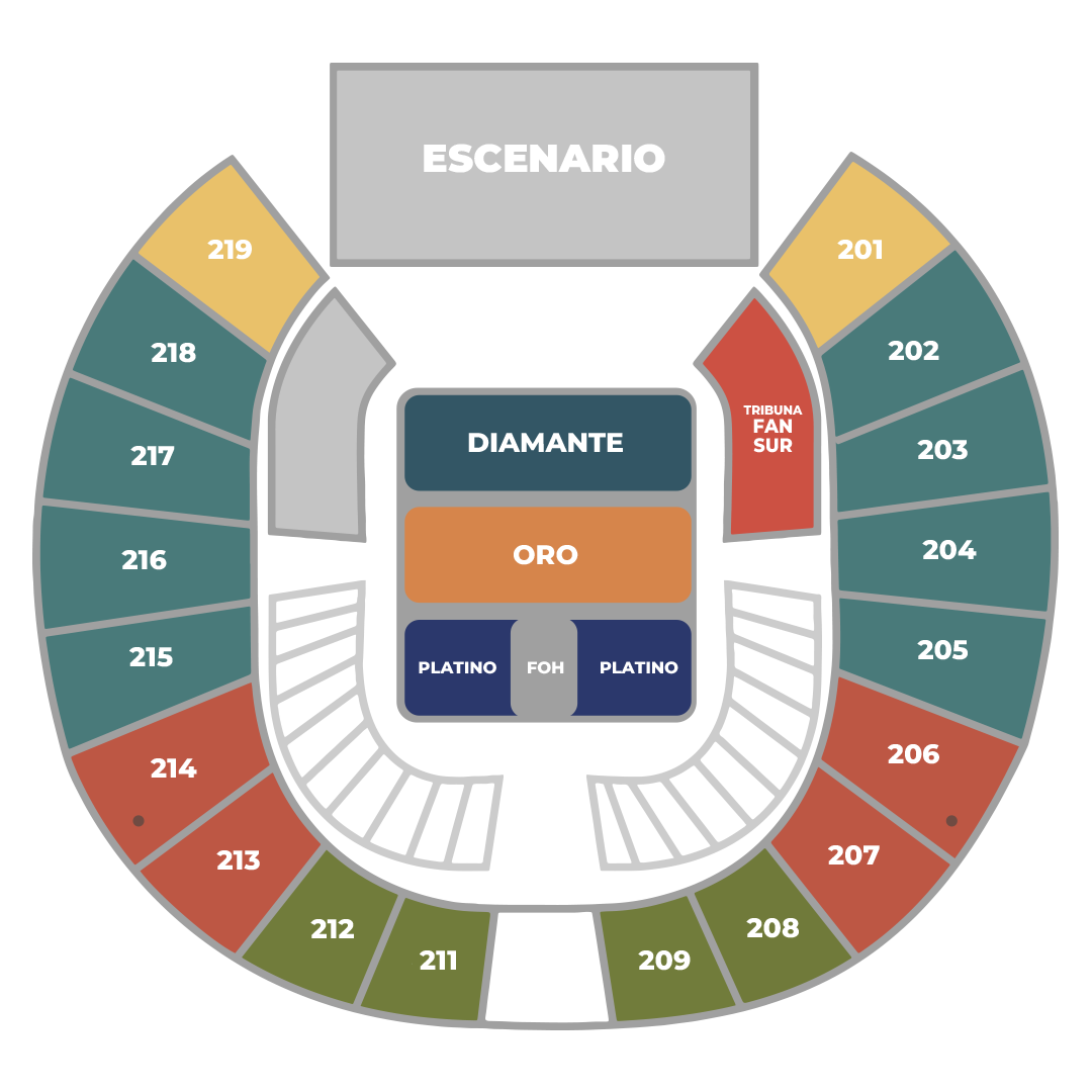 - Los sectores: 201, 219, 301 y 319 pueden tener restricciones de visibilidad dependiendo del montaje que se realice del espectáculo, pantallas, escenarios luces, sonido, etc, situación que reconoce y acepta en el momento de comprar las boletas. En los casos anteriores, no serán de recibo posteriores quejas o reclamaciones relacionadas con este aspecto, es decir con la visibilidad del espectáculo.