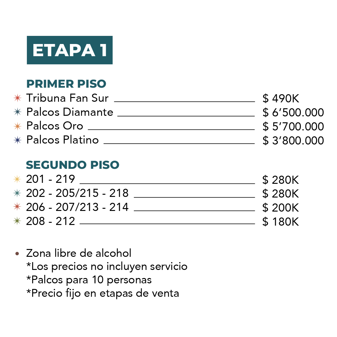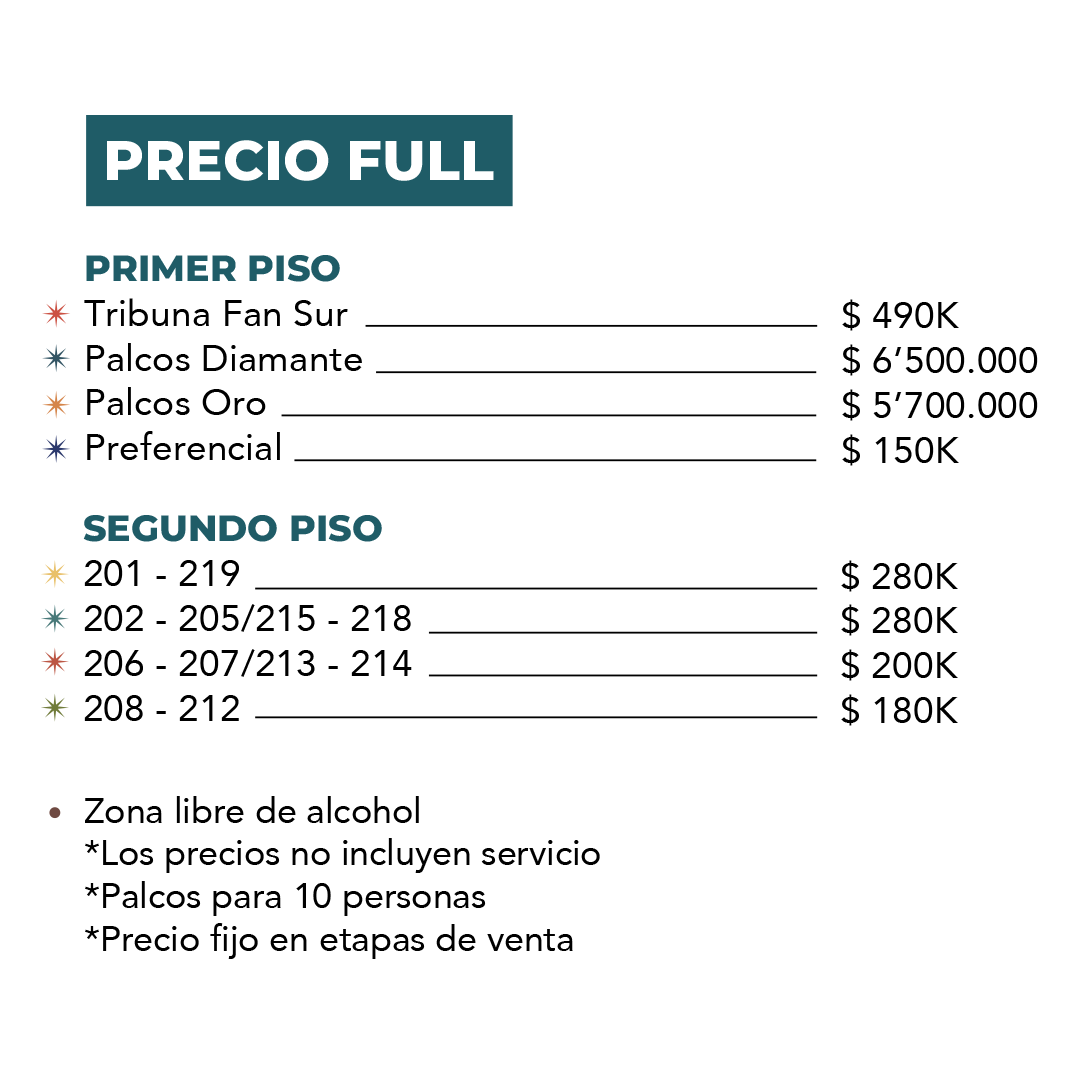 - Se informa a los usuarios que los precios de la boletería para cada localidad experimentarán una transición de la Etapa 1 al Precio Full una vez que se alcance y complete el aforo designado para dicha localidad contemplado en la tabla anterior de precios.