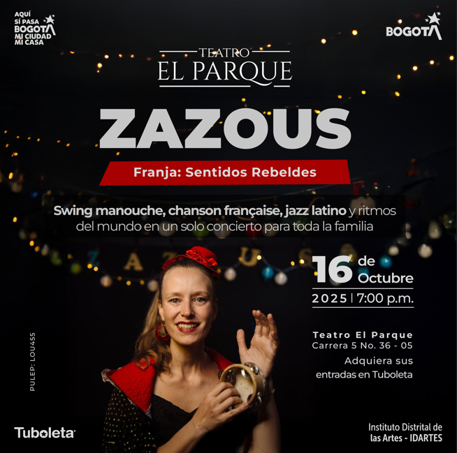 Zazous es una agrupación musical colombiana que fusiona el swing manouche, chanson française, jazz latino y ritmos del mundo. Su propuesta sonora elegante e íntima se adapta a espacios tanto formales como alternativos, con una puesta en escena rica en matices acústicos y gran conexión emocional con el público.