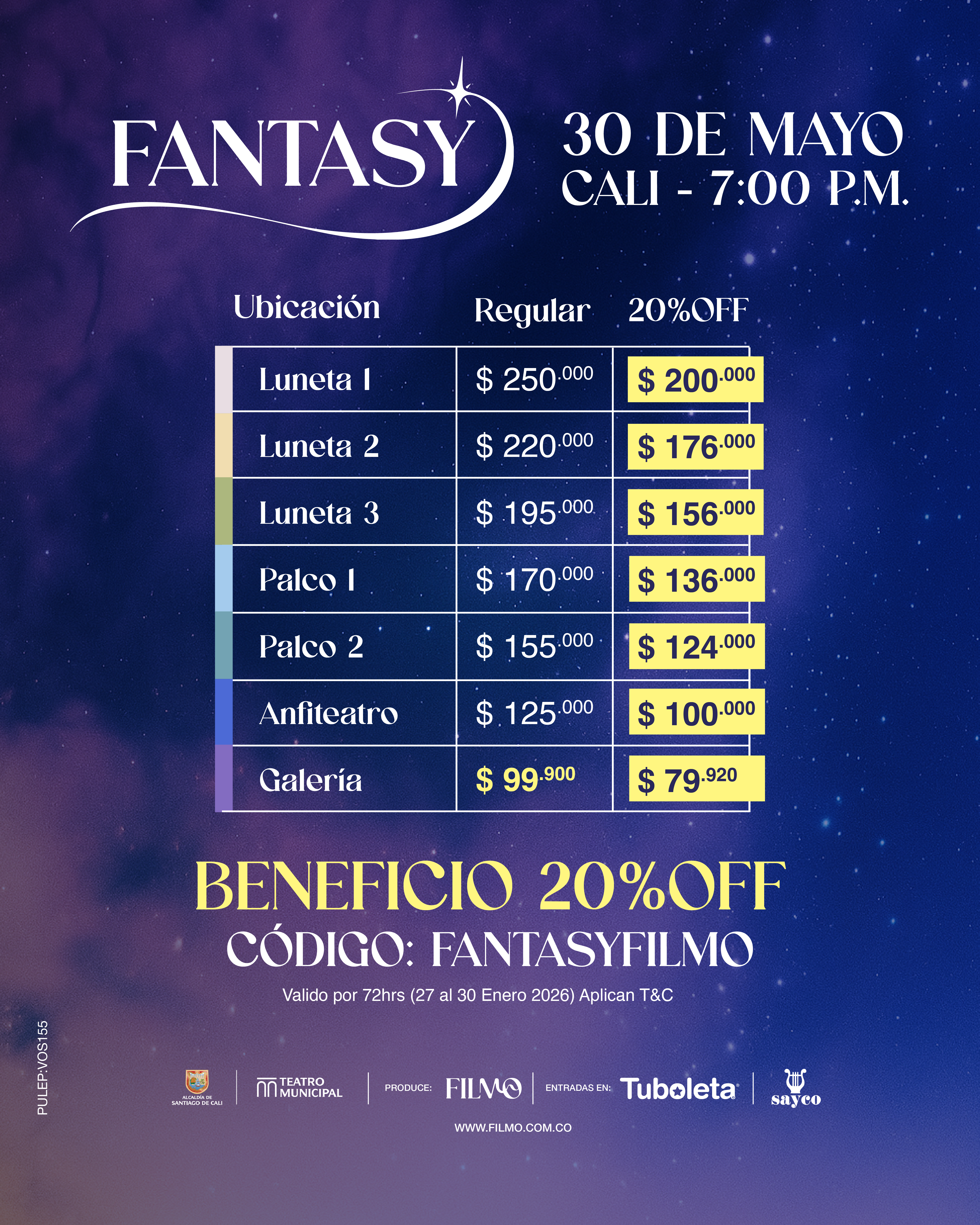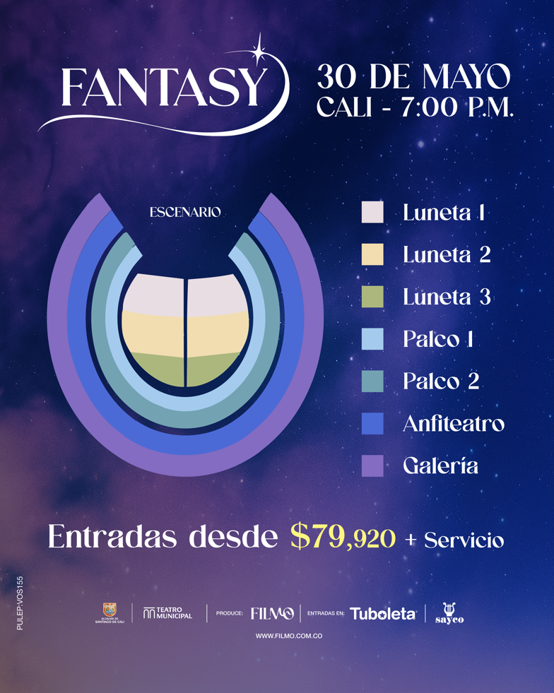 FILMO, una de las orquestas más innovadoras del formato sinfónico en vivo en Colombia, presenta FANTASY en Cali: un espectáculo en gran formato construido sobre la música de Frozen, Encanto, El Rey León y Coco, y más. FANTASY redefine lo que puede ser un concierto familiar: no solo entretenimiento, sino una experiencia sonora, visual y emocional en vivo, con invitados especiales, creada para que el público vuelva a sentir la fantasía en el pecho.