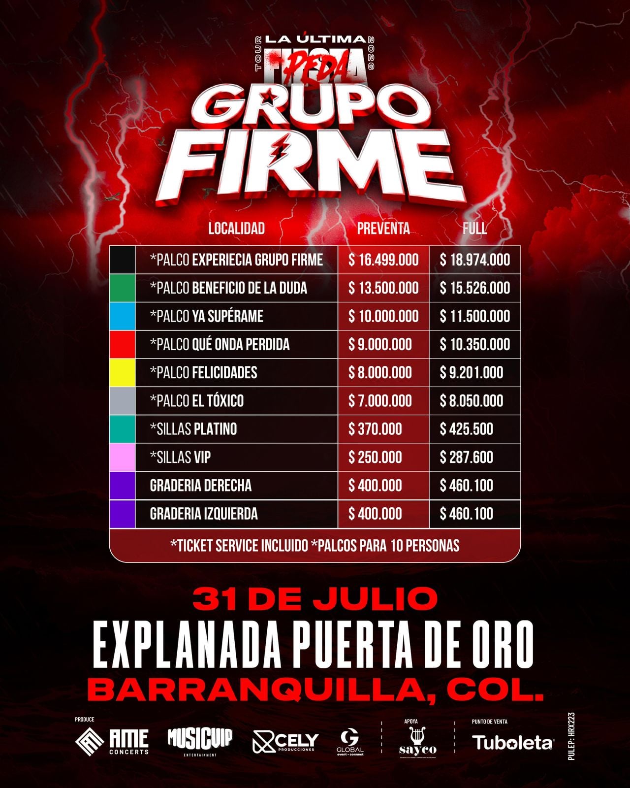 | Experiencia Grupo Firme* | $1.610.000 + $287.400 | 1.060 |