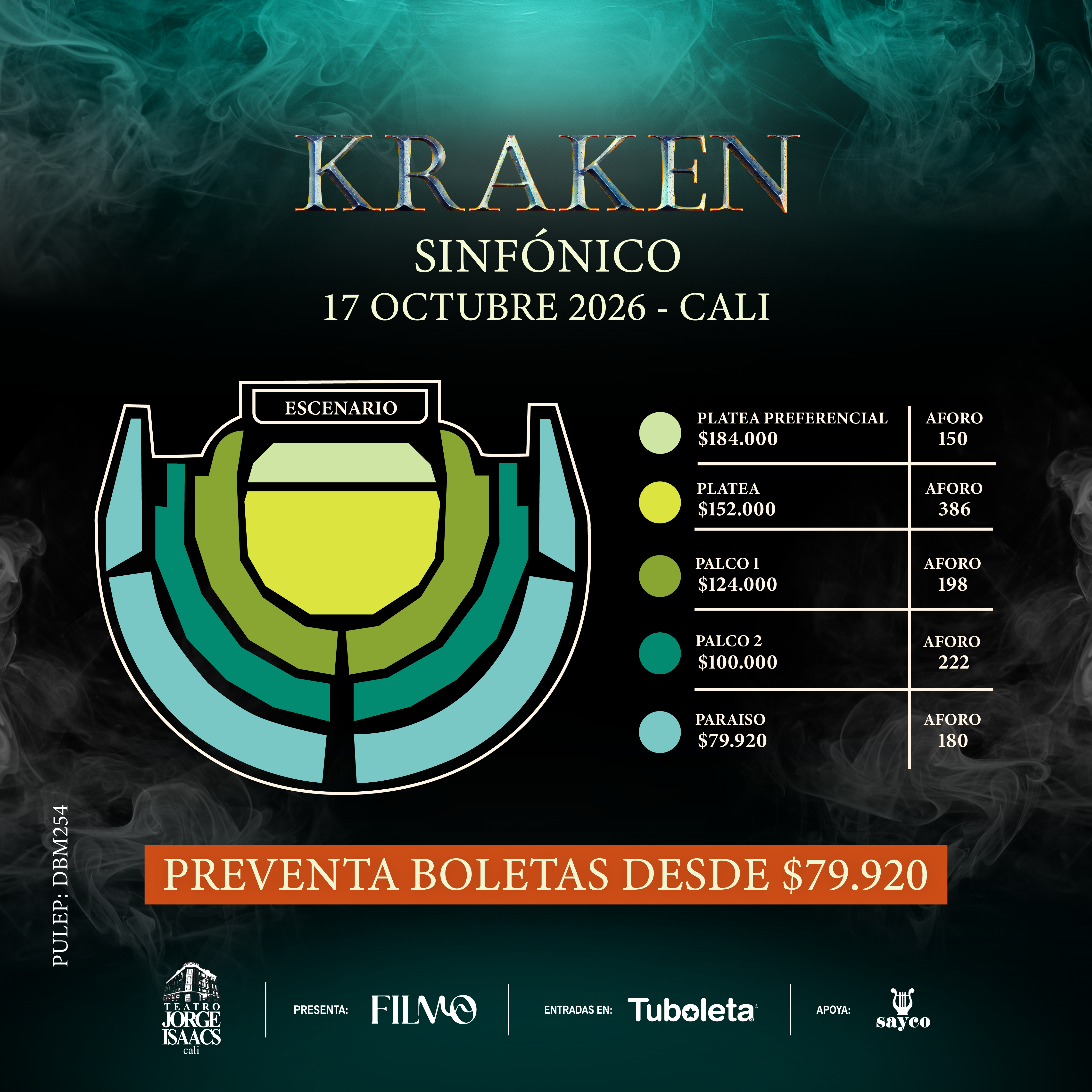 Después de hacer sold out en su primera función en Bogotá, Kraken Sinfónico llega por primera vez y por única vez a Cali con una puesta en escena sin precedentes que lleva los himnos de Kraken a una dimensión monumental.