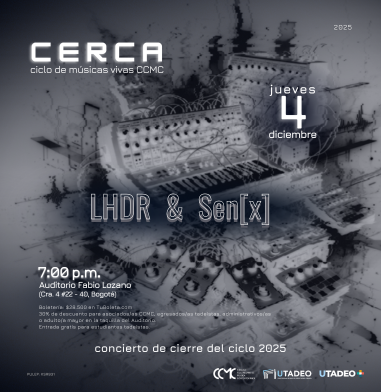LHDR, fundada en 2023 por los músicos Hernán Guzmán y Juan David Guerrero, explora la relación entre sonido e imagen mediante improvisación, síntesis, modelado 3D y live coding, participando en espacios como Voltaje, Toplap y el Festival Imagen-Sonido; además, lanzó su primer disco con Bogotana Records dentro de la electrónica experimental. Sen(x) es un grupo de música experimental integrado por Paula Daniel Bogotá, Andrés Gómez y Julián Vega, enfocado en la creación con nuevas tecnologías e instrumentos electrónicos y acústicos.