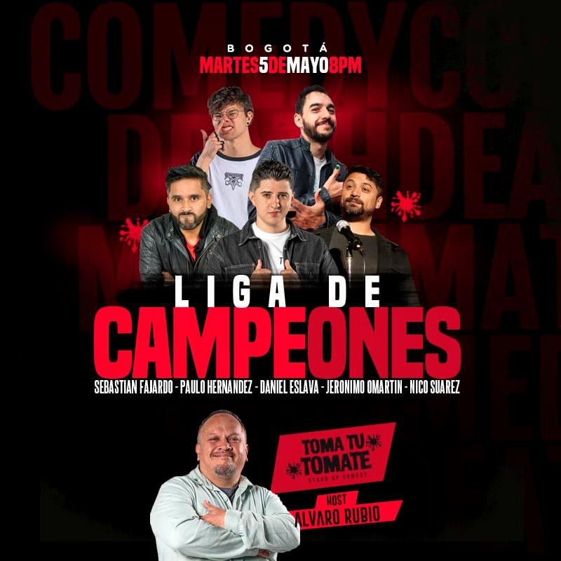 Liga De Campeones de Toma Tu Tomate. Toma Tu Tomate es una familia de formatos de comedia, un holding cómico en el que los comediantes deben enfrentar a un público armado de tomates. El Comedy Death Match es el formato más exigente y adrenalínico de Toma Tu Tomate, en el que 6 comediantes de alto nivel se enfrentan cada noche por el favor del público. Serán noches temáticas para las que los comediantes tendrán que escribir material original, y por si fuera poco, cada noche tendrán que crear nuevos chistes cuando el público les de su propio tema. Al final, solo habrá un ganador y el público tendrá una noche llena de ¡Risas o Tomates!