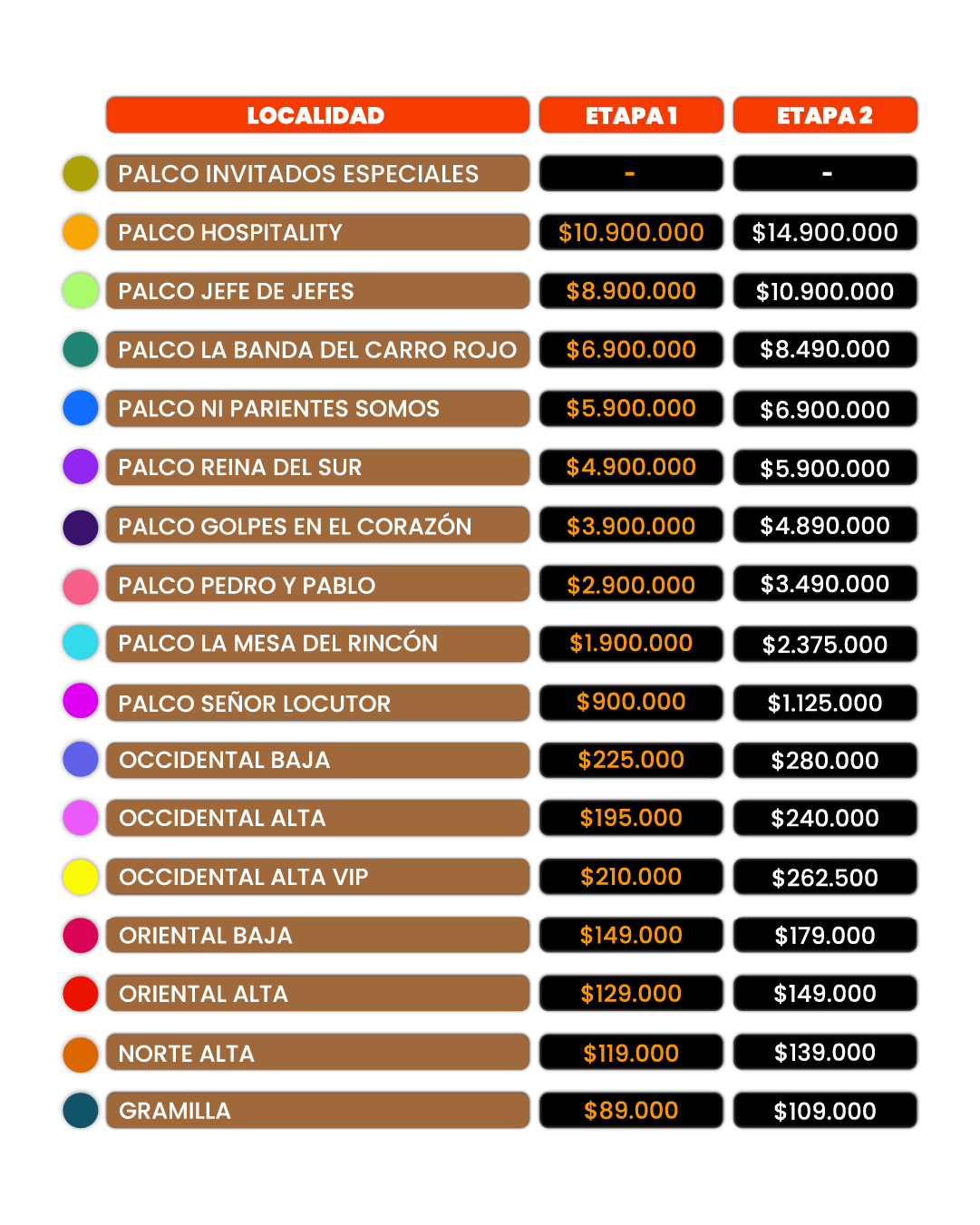 | Palco Jefe de Jefes* | $8.900.000 + $1.960.000 | 136 |
