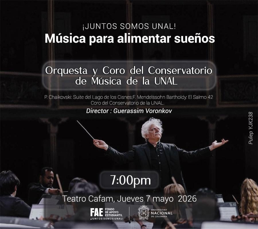 Con el propósito de recaudar recursos que permitan continuar apoyando a estudiantes de la Universidad Nacional en condición de vulnerabilidad, el Fondo de Apoyo Estudiantil de la Universidad Nacional de Colombia continúa en su programación de eventos en su lema "Alimentando Sueños", presentando en esta ocasión a la Orquesta y Coro del Conservatorio de Música de UNAL con:
