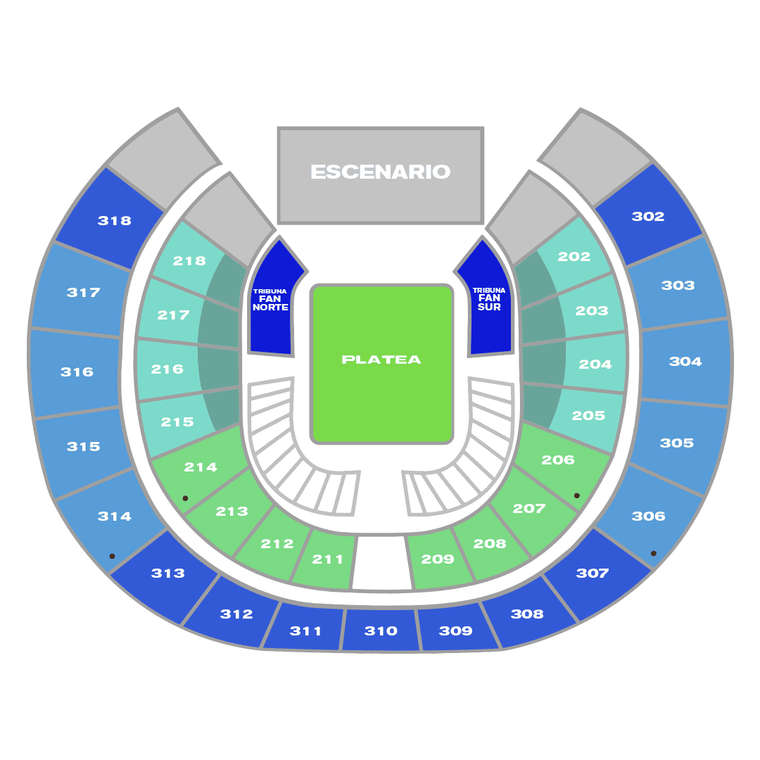 Los sectores: 201, 219, 301 y 319 pueden tener restricciones de visibilidad dependiendo del montaje que se realice del espectáculo, pantallas, escenarios luces, sonido, etc, situación que reconoce y acepta en el momento de comprar las boletas. En los casos anteriores, no serán de recibo posteriores quejas o reclamaciones relacionadas con este aspecto, es decir con la visibilidad del espectáculo.