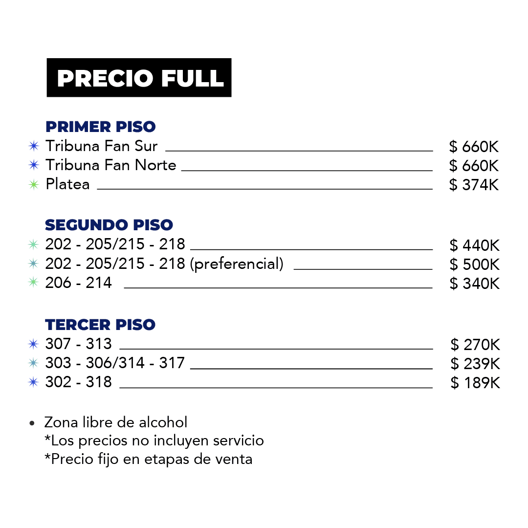 Se informa a los usuarios que los precios de la boletería para cada localidad experimentarán una transición de la Etapa 1 al Precio Full una vez que se alcance y complete el aforo designado para dicha localidad contemplado en la tabla anterior de precios.