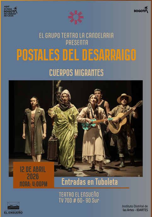 El Teatro El Ensueño presenta Postales del Desarraigo, Cuerpos Migrantes , una creación colectiva del Teatro La Candelaria, que llega a escena en el marco de la conmemoración de sus 60 años de trayectoria. La obra propone un recorrido escénico por las experiencias del éxodo y el desarraigo a través de una serie de imágenes y situaciones construidas desde el trabajo corporal de sus actores y actrices, quienes exploran las emociones, tensiones y contradicciones que atraviesan a quienes se ven obligados a abandonar su lugar de origen y enfrentar nuevas fronteras.