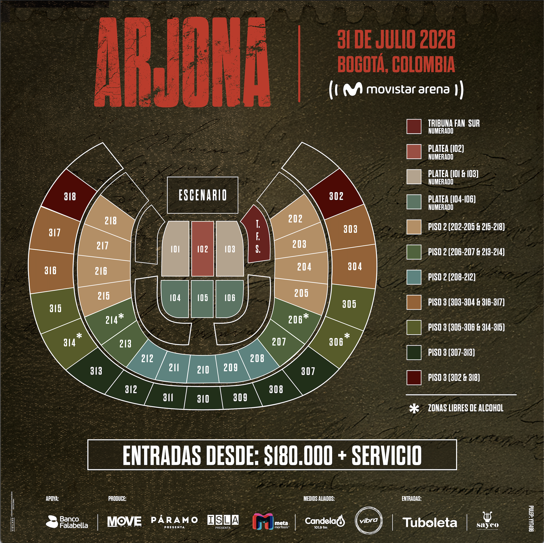 - Los sectores: 201, 219, 301 y 319 pueden tener restricciones de visibilidad dependiendo del montaje que se realice del espectáculo, pantallas, escenarios luces, sonido, etc, situación que reconoce y acepta en el momento de comprar las boletas. En los casos anteriores, no serán de recibo posteriores quejas o reclamaciones relacionadas con este aspecto, es decir con la visibilidad del espectáculo.