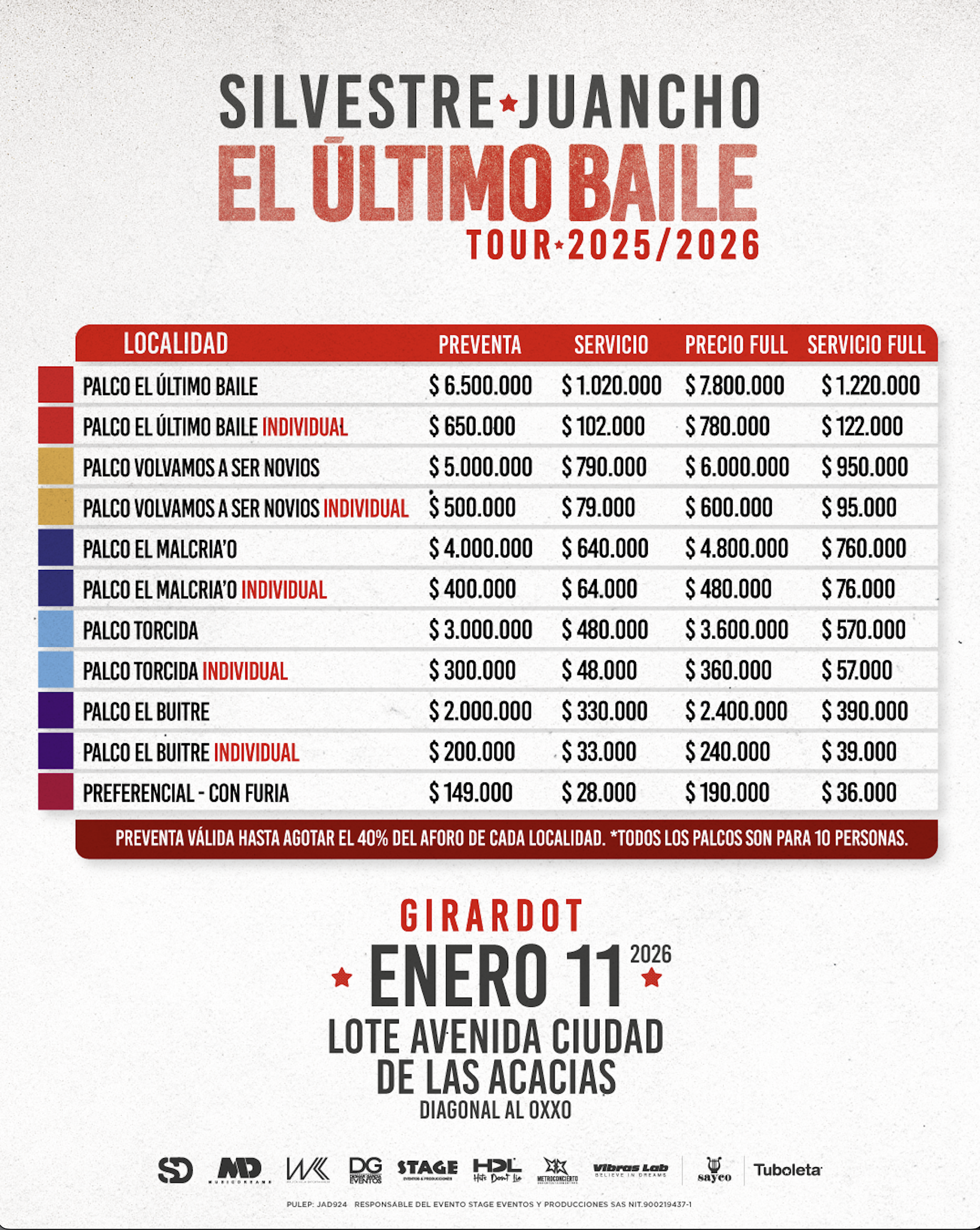 | Palco El Ultimo Baile* | $780.000 + $122.000 | 1.090 |
