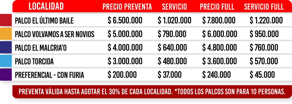 | Palco el Ultimo Baile* | $6.500.000 + $1.020.000 | 42 |