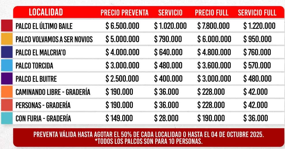 | Palcos El Buitre* | $2.500.000 + $400.000 | 16 |