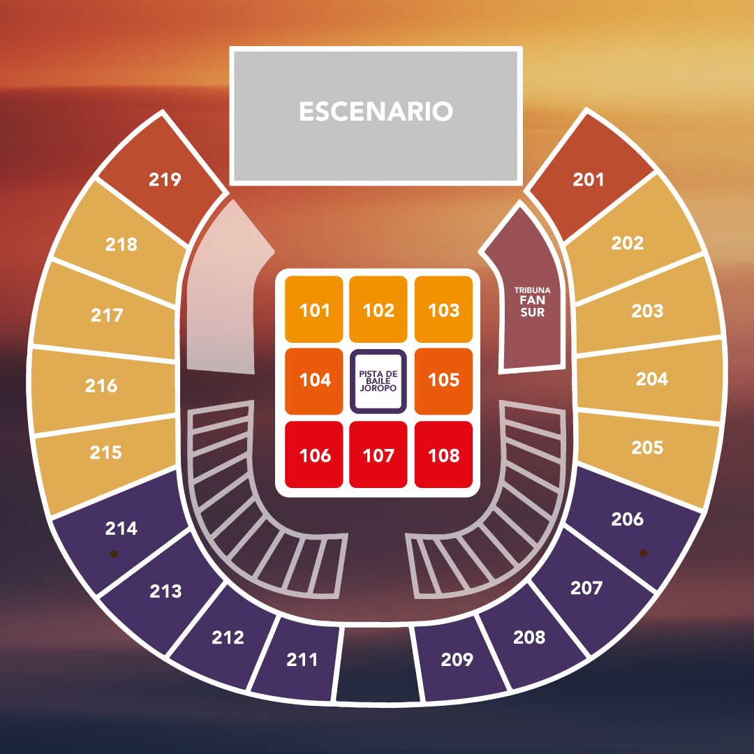- Los sectores: 201, 219, 301 y 319 pueden tener restricciones de visibilidad dependiendo del montaje que se realice del espectáculo, pantallas, escenarios luces, sonido, etc, situación que reconoce y acepta en el momento de comprar las boletas. En los casos anteriores, no serán de recibo posteriores quejas o reclamaciones relacionadas con este aspecto, es decir con la visibilidad del espectáculo.
