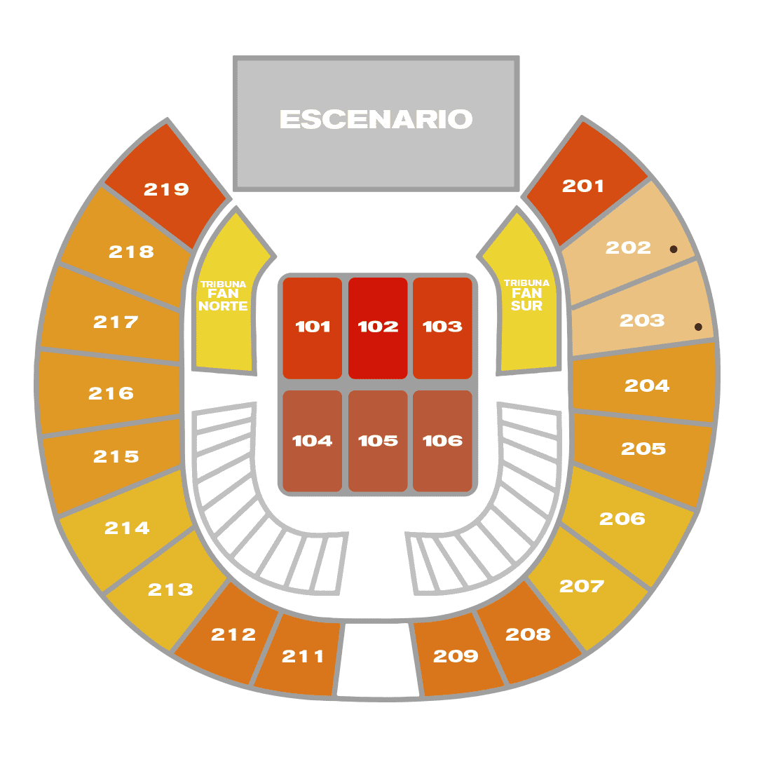 - Los sectores: 201, 219, 301 y 319 pueden tener restricciones de visibilidad dependiendo del montaje que se realice del espectáculo, pantallas, escenarios luces, sonido, etc, situación que reconoce y acepta en el momento de comprar las boletas. En los casos anteriores, no serán de recibo posteriores quejas o reclamaciones relacionadas con este aspecto, es decir con la visibilidad del espectáculo.