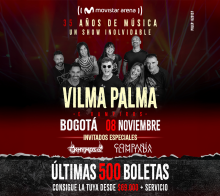 VILMA PALMA E VAMPIROS | 35 AÑOS DE MÚSICA Movistar Arena Bogotá 8 Nov Sáb 8 Nov VILMA PALMA E VAMPIROS | 35 AÑOS DE MÚSICA Bogotá 30 Oct Jue