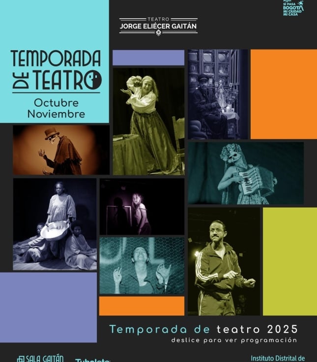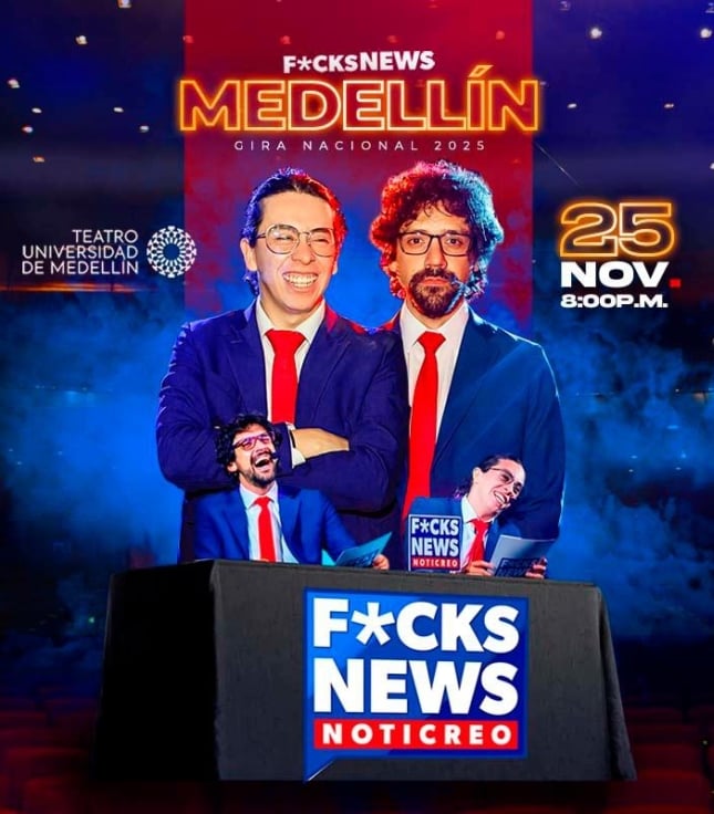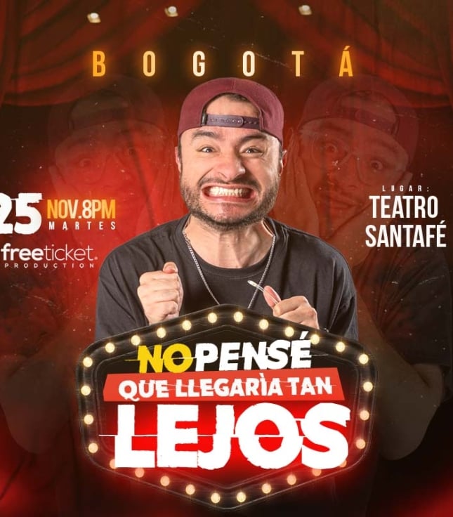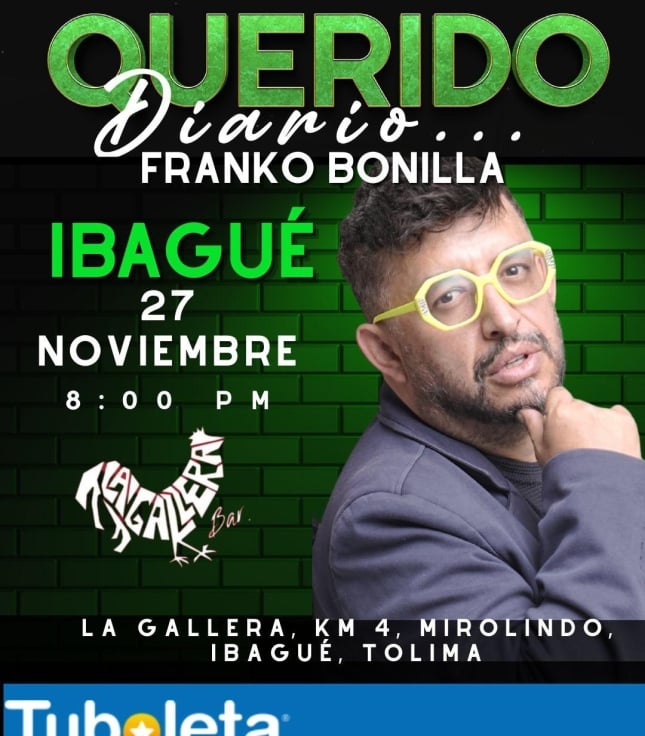 Destacados BARBASURA Y LA TORTUGA Teatro El Parque Bogotá 23 Nov Dom 23 Nov NO PENSÉ QUE LLEGARÍA TAN LEJOS - BOGOTÁ Teatro Santafé - Bogotá Bogotá 25 Nov Mar 25 Nov FUCKS NEWS NOTICREO - NOVIEMBRE Teatro Universidad de Medellín Medellín 25 Nov Mar 25 Nov CALIENTE CALIENTE: EL SHOW DE LAS MENOPAUSIA Sala Gaitán Bogotá 26 Nov Mié 26 Nov MAL AGÜERO BOOM STAND UP BAR - Cl. 26 #43g-30 BARRIO COLOMBIA Medellín 27 Nov Jue 27 Nov QUERIDO DIARIO - FRANKO - IBAGUÉ La Gallera Ibagué 27 Nov Jue 27 Nov Serie Bach a Mozart Centro Nacional de las artes - Sala Delia Zapata Cll11# 5-60 Bogotá 27 Nov Jue 27 Nov Mostrar más eventos Movistar Arena Dg. 61c #26-36, Teusaquillo Teatro Julio Mario Santodomingo Cl. 170 #67-51 Teatro Colsubsidio Av. El Dorado #25-40, Bogotá Maloka Centro Interactivo Maloka, Cra. 68d #24A - 51 Teatro CAFAM Ak 68 #90 - 88 Centro Nacional de las Artes Cl. 11 #5 - 60 Teatro Metropolitano Cl. 41 # 57 - 30, La Candelaria, Medellín. Teatro El Tesoro Carrera 25A # 1A Sur - 45 Medellín. Teatro El Ensueño Tv. 70 D #60-90, Sur, Bogotá Teatro Jorge Eliécer Gaitán Cra. 7 #22-47, Santa Fé, Bogotá. Teatro La Concha Calle 4 #10-48, Cali