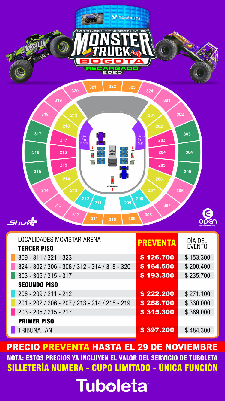 - Los sectores: 201, 219, 301 y 319 pueden tener restricciones de visibilidad dependiendo del montaje que se realice del espectáculo, pantallas, escenarios luces, sonido, etc, situación que reconoce y acepta en el momento de comprar las boletas. En los casos anteriores, no serán de recibo posteriores quejas o reclamaciones relacionadas con este aspecto, es decir con la visibilidad del espectáculo.