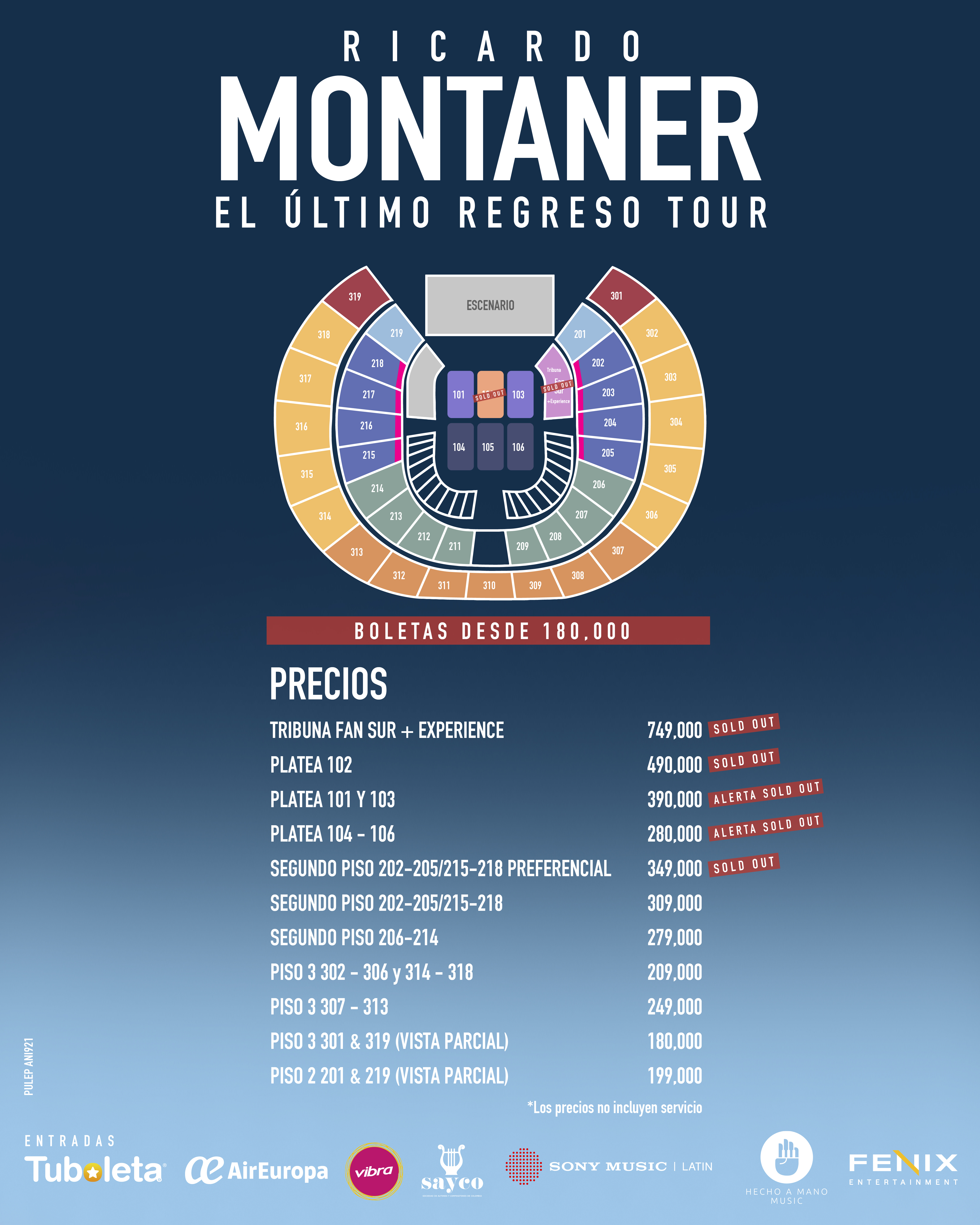 - Los sectores: 201, 219, 301 y 319 pueden tener restricciones de visibilidad dependiendo del montaje que se realice del espectáculo, pantallas, escenarios luces, sonido, etc, situación que reconoce y acepta en el momento de comprar las boletas. En los casos anteriores, no serán de recibo posteriores quejas o reclamaciones relacionadas con este aspecto, es decir con la visibilidad del espectáculo.