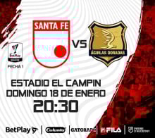 SANTA FE VS AGUILAS DORADAS 2026-1 Estadio El Campín Bogotá 18 Ene Dom 18 Ene SANTA FE VS AGUILAS DORADAS 2026-1 Bogotá 15 Ene Jue