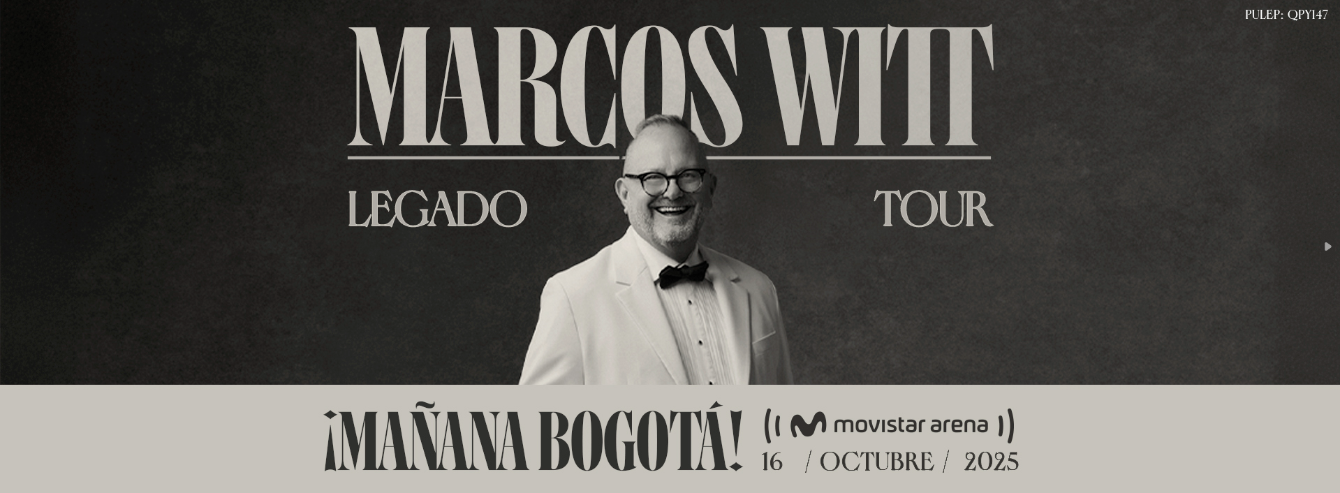. Destacados SANTIAGO CRUZ | QUINCE DE CAMINOS Movistar Arena Bogota 17 Oct Vie 17 Oct SANTIAGO CRUZ | QUINCE DE CAMINOS Bogota 16 Oct Jue Maisky Trio y Orquesta Sinfónica Nacional de Colombia Teatro Mayor Julio Mario Santo Domingo Bogotá 18 Oct Sáb 18 Oct Maisky Trio y Orquesta Sinfónica Nacional de Colombia Bogotá 16 Oct Jue CORONA SUNSETS SESSIONS - MEDELLÍN Medellín 18 Oct Sáb 18 Oct CORONA SUNSETS SESSIONS - MEDELLÍN Medellín 16 Oct Jue ANDY RIVERA | UN DÍA A LA VEZ Movistar Arena Bogota 18 Oct Sáb 18 Oct ANDY RIVERA | UN DÍA A LA VEZ Bogota 16 Oct Jue SILVESTRE Y JUANCHO | EL ÚLTIMO BAILE TOUR 2025 - CÚCUTA Cúcuta Estadio General Santander Cúcuta 18 Oct Sáb 18 Oct SILVESTRE Y JUANCHO | EL ÚLTIMO BAILE TOUR 2025 - CÚCUTA Cúcuta 16 Oct Jue Mentes Expertas - Marian Rojas Estape - Bogotá Movistar Arena Bogota 22 Oct Mié 22 Oct Mentes Expertas - Marian Rojas Estape - Bogotá Bogota 16 Oct Jue BRYAN ADAMS | ROLL WITH THE PUNCHES Movistar Arena Bogota 20 Mar Vie 20 Mar BRYAN ADAMS | ROLL WITH THE PUNCHES Bogota 16 Oct Jue La Generación del Perreo PLAZA DE TOROS DE MANIZALES Manizales 8 Nov Sáb 8 Nov La Generación del Perreo Manizales 16 Oct Jue MIGUEL BOSÉ | IMPORTANTE TOUR 2026 Movistar Arena Bogota 11 Mar Mié 11 Mar MIGUEL BOSÉ | IMPORTANTE TOUR 2026 Bogota 16 Oct Jue Mostrar más eventos Conciertos ANUEL AA | RHLM 2 - PASALA Movistar Arena Bogota 24 Oct Vie 24 Oct ANUEL AA | RHLM 2 - PASALA Bogota 16 Oct Jue SHOW FIN DE AÑO 2025 THE BEATLES & MONTESSORI Centro de Convenciones Cartagena Cartagena 18 Oct Sáb 18 Oct SHOW FIN DE AÑO 2025 THE BEATLES & MONTESSORI Cartagena 16 Oct Jue V DE VINILO Teatro Astor Plaza Bogota 18 Oct Sáb 18 Oct V DE VINILO Bogota 16 Oct Jue ORALE WEY | FEST MEXA - PASALA Estadio El Campín Bogotá 6 Dic Sáb 6 Dic ORALE WEY | FEST MEXA - PASALA Bogotá 16 Oct Jue BUBASETA AND FRIENDS Movistar Arena Bogota 25 Oct Sáb 25 Oct BUBASETA AND FRIENDS Bogota 16 Oct Jue Yuri Buenaventura lanza álbum Ámame y éxitos de siempre Teatro Colsubsidio Bogotá 8 Nov Sáb 8 Nov Yuri Buenaventura lanza álbum Ámame y éxitos de siempre Bogotá 16 Oct Jue VILMA PALMA E VAMPIROS | 35 AÑOS DE MÚSICA Movistar Arena Bogota 8 Nov Sáb 8 Nov VILMA PALMA E VAMPIROS | 35 AÑOS DE MÚSICA Bogota 16 Oct Jue Teatro 1-2-3 Por Mí y por mis talentos Teatro Santander Bucaramanga 8 Nov Sáb 8 Nov 1-2-3 Por Mí y por mis talentos Bucaramanga 16 Oct Jue CONCIERTO EN FAMILIA N°4 SOÑANDO CON PEER GYNT Teatro Metropolitano de Medellín Medellín 19 Oct Dom 19 Oct CONCIERTO EN FAMILIA N°4 SOÑANDO CON PEER GYNT Medellín 16 Oct Jue Habûb Centro Nacional de las artes - Sala Fanny Mikey Cll 11# 5-60 Bogotá Desde 9 Oct Jue 9 Oct Hasta 19 Oct Dom 19 Oct Habûb Bogotá 16 Oct Jue RITA-OPERA Centro Nacional de las artes - Sala Teatro Colón cll10 #5-32 Bogotá Desde 16 Oct Jue 16 Oct Hasta 18 Oct Sáb 18 Oct RITA-OPERA Bogotá 16 Oct Jue Marco Tamayo (Cub, Aut) - Raúl Fernando Madrid (Col) Teatro Colsubsidio Bogotá 15 Oct Mié 15 Oct Marco Tamayo (Cub, Aut) - Raúl Fernando Madrid (Col) Bogotá 16 Oct Jue GOODBYE Centro Nacional de las artes - Sala Delia Zapata Cll11# 5-60 Bogotá Desde 16 Oct Jue 16 Oct Hasta 18 Oct Sáb 18 Oct GOODBYE Bogotá 16 Oct Jue Familia & Experiencias PICUS EN CONCIERTO Royal Center Bogotá PICUS EN CONCIERTO Bogotá 16 Oct Jue VAN GOGH LA LOCURA DEL COLOR - MEDELLÍN Teatro El Tesoro Medellín 13 Nov Jue 13 Nov VAN GOGH LA LOCURA DEL COLOR - MEDELLÍN Medellín 16 Oct Jue ANIME Fundación Teatro Calima Cali 18 Oct Sáb 18 Oct ANIME Cali 16 Oct Jue SUN & SEA Ciudadela Cuarta Revolución Y Tranformación Del Aprendizaje Medellin Desde 23 Oct Jue 23 Oct Hasta 26 Oct Dom 26 Oct SUN & SEA Medellin 16 Oct Jue ILUSIONISTAS - MAGIA A OTRO NIVEL Teatro Astor Plaza Bogota Desde 22 Oct Mié 22 Oct Hasta 26 Oct Dom 26 Oct ILUSIONISTAS - MAGIA A OTRO NIVEL Bogota 16 Oct Jue TRIBUTO SINFÓNICO U2 Teatro Metropolitano de Medellín Medellín 22 Nov Sáb 22 Nov TRIBUTO SINFÓNICO U2 Medellín 16 Oct Jue MONSTER TRUCK BOGOTÁ 2025 Movistar Arena Bogota 30 Nov Dom 30 Nov MONSTER TRUCK BOGOTÁ 2025 Bogota 16 Oct Jue Deportes MOVE & FLOW Malecón Turístico Río Magdalena BARRANQUILLA 8 Nov Sáb 8 Nov MOVE & FLOW BARRANQUILLA 16 Oct Jue COMBO LLANEROS VS ONCE CALDAS Y NACIONAL 2025-2 Estadio Bello Horizonte - Rey Pelé (Villavicencio) Villavicencio 19 Oct Dom 19 Oct COMBO LLANEROS VS ONCE CALDAS Y NACIONAL 2025-2 Villavicencio 16 Oct Jue BOYACÁ CHICÓ VS SANTA FE 2025-2 Estadio la Independencia Tunja 17 Oct Vie 17 Oct BOYACÁ CHICÓ VS SANTA FE 2025-2 Tunja 16 Oct Jue GRAN PREMIO ELECTROLIT DEL CARIBE 2025 Malecón - Calle 72 BARRANQUILLA Desde 14 Nov Vie 14 Nov Hasta 16 Nov Dom 16 Nov GRAN PREMIO ELECTROLIT DEL CARIBE 2025 BARRANQUILLA 16 Oct Jue Venues Movistar Arena Dg. 61c #26-36, Teusaquillo Teatro CAFAM Ak 68 #90 - 88 Teatro Mayor Julio Mario Santo Domingo Cl. 170 #67-51 Teatro Colsubsidio Av. El Dorado #25-40, Bogotá Teatro Jorge Eliécer Gaitán Cra. 7 #22-47, Santa Fé, Bogotá. Centro Nacional de las Artes Cl. 11 #5 - 60 Teatro Metropolitano Cl. 41 # 57 - 30, La Candelaria, Medellín. Teatro Astor Plaza Cl. 67 #11 – 58 Teatro El Tesoro Carrera 25A # 1A Sur - 45 Medellín. Auditorio Fabio Lozano Cra. 4 #Carrera 4 # 22 - 61, La Candelaria, Bogotá Cinemateca Cra. 3 #19-10, Santa Fé Planetario de Bogotá Calle 26B No. 5-93 Maloka Centro Interactivo Maloka, Cra. 68d #24A - 51 Teatro El Ensueño Tv. 70 D #60-90, Sur, Bogotá Sala de Conciertos de la Biblioteca Luis Angel Arango Cl. 11 #14, Bogotá. Teatro El Parque Cra. 5 # 36 - 05 Planetario de Cali - Yawa Cra. 37a #5- 27, Cali Teatro Santander Cl. 33 #18-60 Categorías Conciertos Teatro Deportes Familiar Festivales Foros Museos Experiencias Te pueden interesar