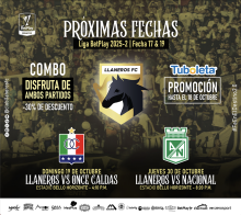 COMBO LLANEROS VS ONCE CALDAS Y NACIONAL 2025-2 Estadio Bello Horizonte - Rey Pelé (Villavicencio) Villavicencio 19 Oct Dom 19 Oct COMBO LLANEROS VS ONCE CALDAS Y NACIONAL 2025-2 Villavicencio 16 Oct Jue
