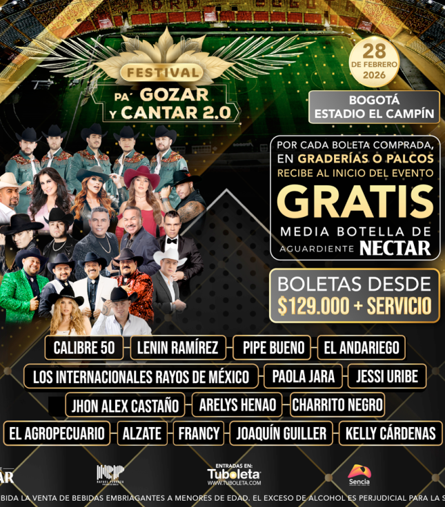 Destacados GIGANTES DEL ROCK 2.0 Movistar Arena Bogotá 19 Feb Jue 19 Feb ZAZ Teatro Jorge Eliécer Gaitán Bogotá 22 Feb Dom 22 Feb BIG TIME RUSH 2026 Movistar Arena Bogotá 24 Feb Mar 24 Feb CUARTETO DE NOS | TOUR PUERTAS Movistar Arena Bogotá 27 Feb Vie 27 Feb FESTIVAL PA´ GOZAR Y CANTAR 2.0 Estadio El Campín Bogotá 28 Feb Sáb 28 Feb KAPO Movistar Arena Bogotá 07 Mar Sáb 07 Mar MIGUEL BOSÉ | IMPORTANTE TOUR 2026 Movistar Arena Bogotá 11 Mar Mié 11 Mar Mostrar más eventos