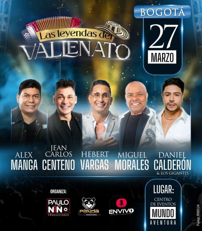 Destacados PABLO ALBORÁN - Global Tour - Bogotá Movistar Arena Bogotá 14 Mar Sáb 14 Mar BRYAN ADAMS | ROLL WITH THE PUNCHES Movistar Arena Bogotá 20 Mar Vie 20 Mar LAS LEYENDAS DEL VALLENATO BOGOTÁ MUNDO AVENTURA Bogotá 27 Mar Vie 27 Mar AVATAR | LIVE IN CONCERT Movistar Arena Bogotá 28 Mar Sáb 28 Mar RICARDO MONTANER | EL ÚLTIMO REGRESO TOUR Movistar Arena Bogotá 09 Abr Jue 09 Abr LAURA PAUSINI BOGOTA 2026 Movistar Arena Bogotá 22 Abr Mié 22 Abr RYAN CASTRO SENDÉ WORLD TOUR | REGRESO A CASA - MEDELLÍN Estadio Atanasio Girardot Medellín 25 Abr Sáb 25 Abr Mostrar más eventos