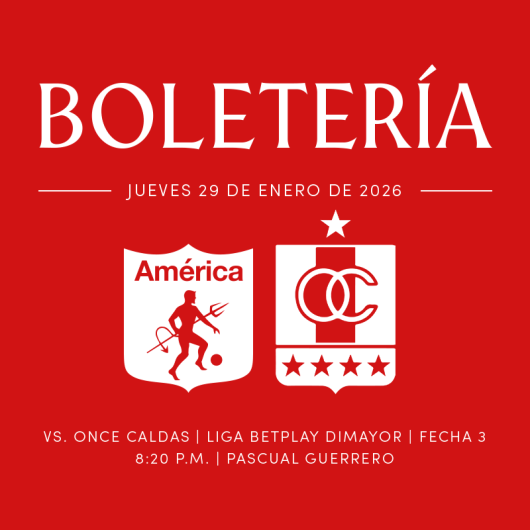Destacados AMÉRICA DE CALI | ABONOS 2026-1 Estadio Pascual Guerrero Cali 28 Ene Mié 28 Ene SANTA FE VS PEREIRA 2026-1 Estadio El Campín Bogotá 28 Ene Mié 28 Ene AMÉRICA DE CALI VS ONCE CALDAS 2026-1 Estadio Pascual Guerrero Cali 29 Ene Jue 29 Ene ACCESO TOTAL LLANEROS Estadio Bello Horizonte - Rey Pelé (Villavicencio) Villavicencio 01 Feb Dom 01 Feb ISSA FEST 2026 Parque Museo el Chicó Bogotá 28 Feb Sáb 28 Feb ABONOS ONCE CALDAS 2026-1 Estadio Palogrande Manizales 31 Jul Vie 31 Jul