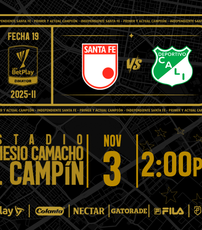 Destacados EQUIDAD VS FORTALEZA 2025-2 Estadio Metropolitano De Techo Bogotá 29 Oct Mié 29 Oct SANTA FE VS CALI 2025-2 Estadio El Campín Bogotá 03 Nov Lun 03 Nov AMÉRICA DE CALI VS UNIÓN MAGDALENA 2025-2 Estadio Pascual Guerrero Cali 03 Nov Lun 03 Nov MOVE & FLOW Malecón Turístico Río Magdalena Barranquilla 08 Nov Sáb 08 Nov GRAN PREMIO ELECTROLIT DEL CARIBE 2025 Malecón - Calle 72 Barranquilla Desde 14 Nov Vie 14 Nov Hasta 16 Nov Dom 16 Nov