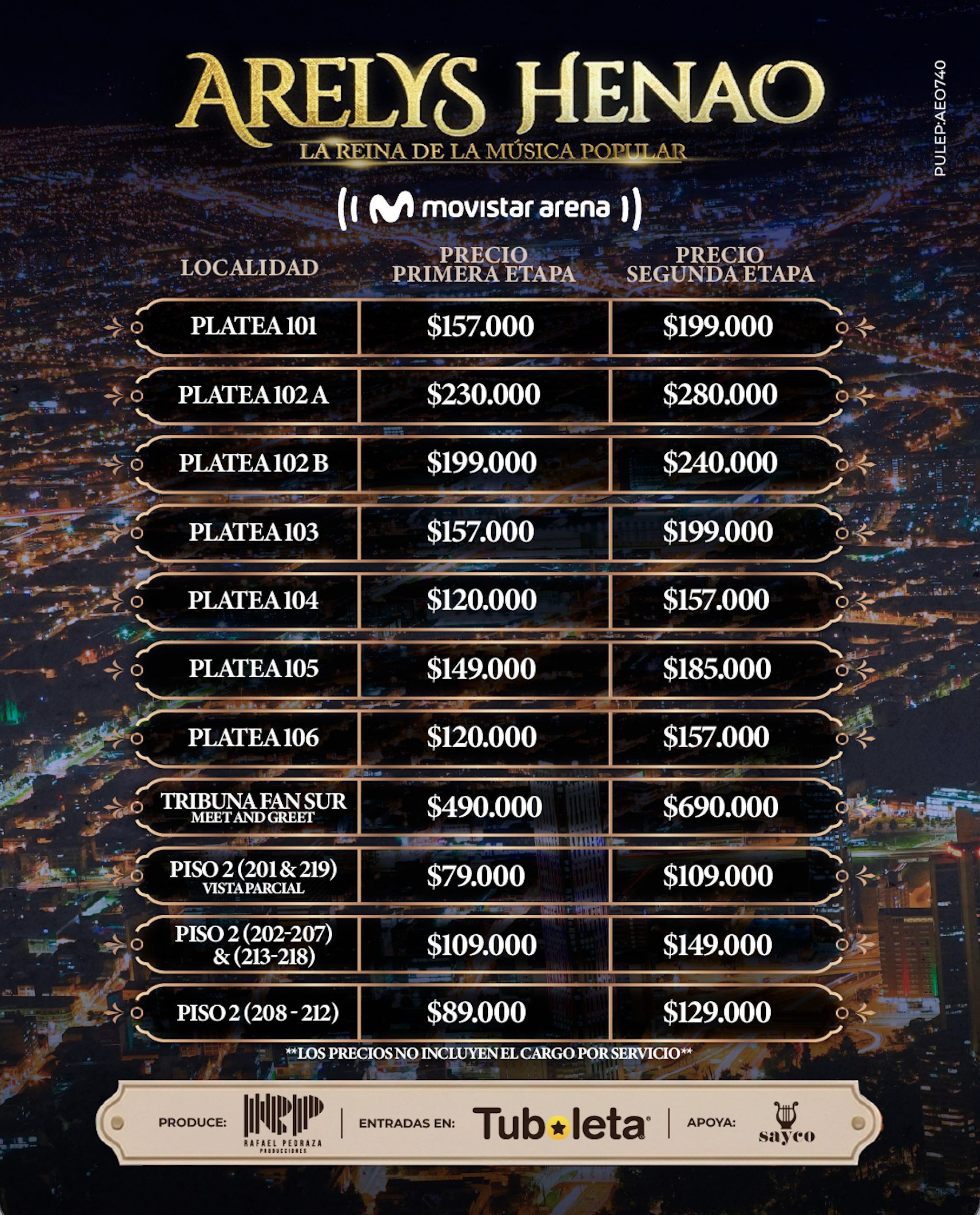 | Tribuna Fan Sur - Meet & Greet | $490.000 + $87.500 | 155 |