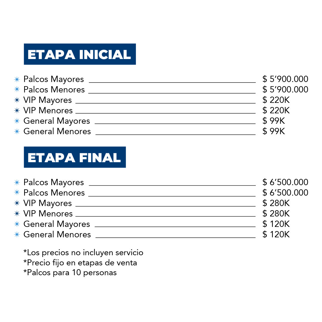 | Palcos Menores* | $650.000 + $89.400 | 30 |