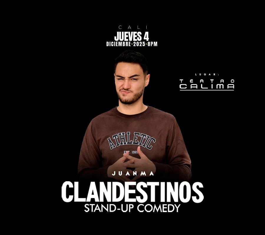 Clandestinos Stand-up comedy ¡El proyecto mas ambicioso de comedia en Colombia! Los mejores comediantes de stand-up comedy, estaran en el Teatro Calima temporada de un mes, exponiendo su show al publico.. desde el 2018 a su nueva temporada del 2021. y aun en 2025 con este gran proyecto de darle visibilidad a los grandes comediantes del pais.