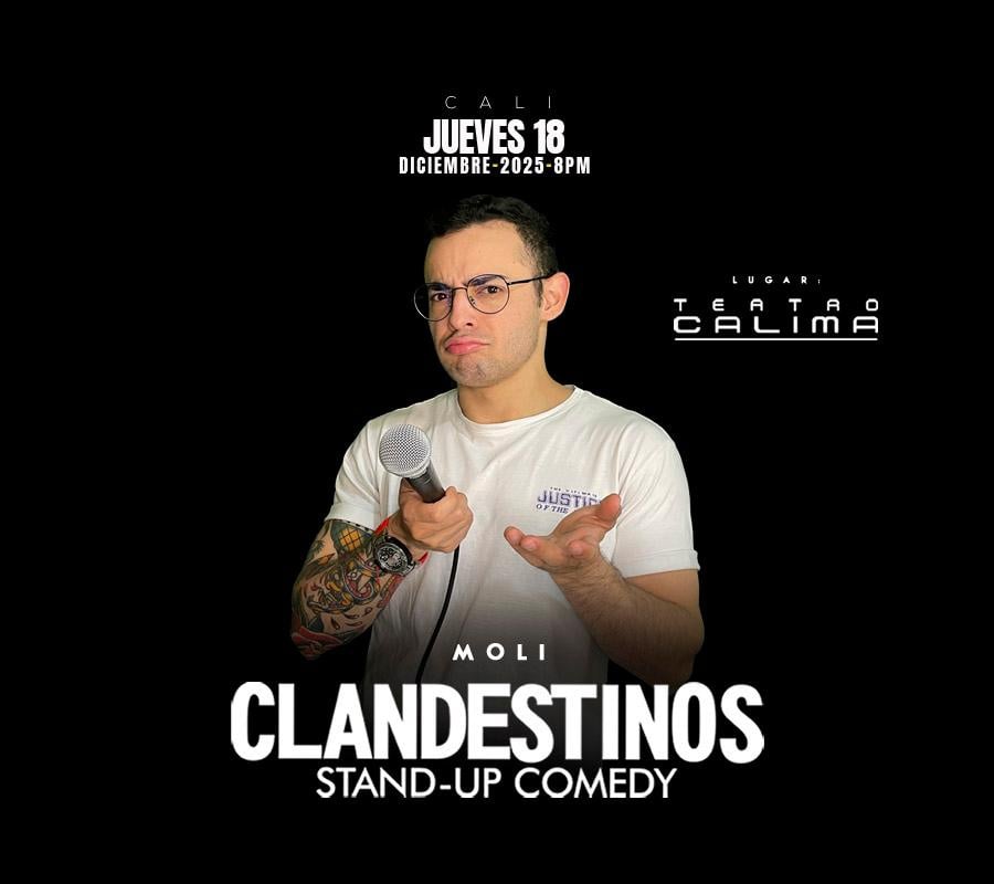 Clandestinos Stand-up comedy ¡El proyecto mas ambicioso de comedia en Colombia! Los mejores comediantes de stand-up comedy, estaran en el Teatro Calima temporada de un mes, exponiendo su show al publico.. desde el 2018 a su nueva temporada del 2021. y aun en 2025 con este gran proyecto de darle visibilidad a los grandes comediantes del pais.