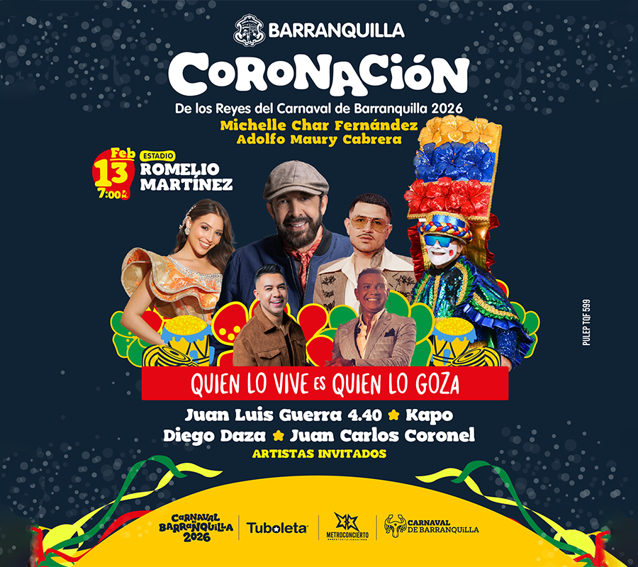 La soberana Michelle Char Fernández y el Rey Momo Adolfo Maury Cabrera serán proclamados en un espectáculo de gran formato que celebra la tradición, la música y la esencia de la fiesta más importante de Colombia. Una imponente y moderna puesta en escena, diseñada especialmente para esta noche histórica, se une a un cartel musical de primer nivel con los grandes éxitos de Juan Luis Guerra, Kapo, Diego Daza y Juan Carlos Coronel, en una experiencia que hará vibrar a miles de carnavaleros.