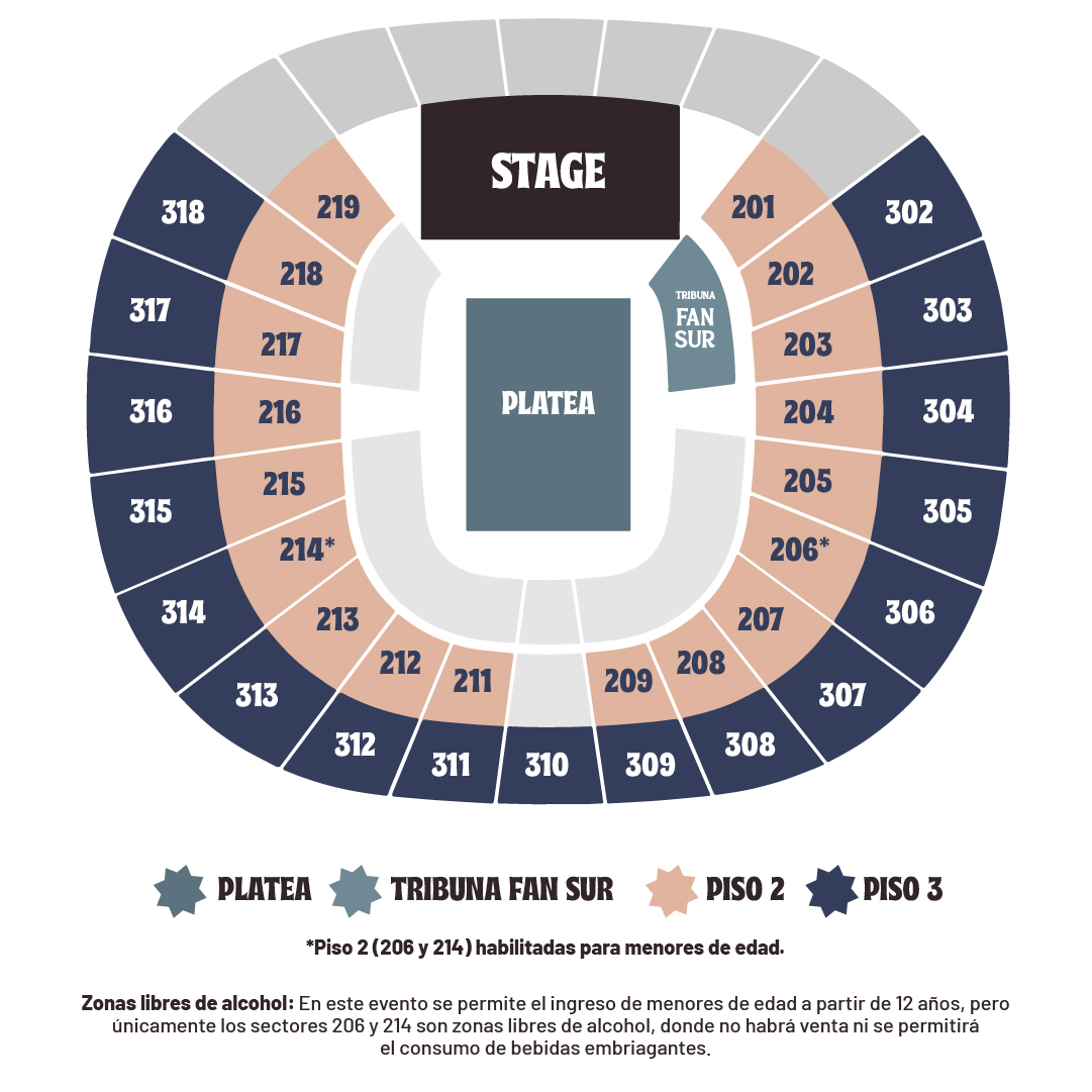 En este evento público se permite el ingreso de menores de edad. El Movistar Arena ha habilitados los sectores 206, 214, 306 y 314 como Zonas Libres de Alcohol, donde no habrá venta ni consumo de bebidas embriagantes. No obstante, es responsabilidad de quien ejerce la patria potestad definir el lugar donde el menor disfrutará del espectáculo, se RECOMIENDA que los menores de edad se ubiquen en estas zonas para su comodidad.