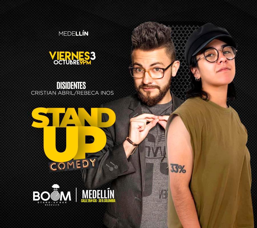 "DISIDENTES" es un show de stand-up comedy de Rebecca Inos y Cristian Abril que mezcla humor negro y aguda crítica social. Con ironía y provocación, retratan las contradicciones, absurdos y realidades de Colombia, invitando al público a reír y reflexionar al mismo tiempo.