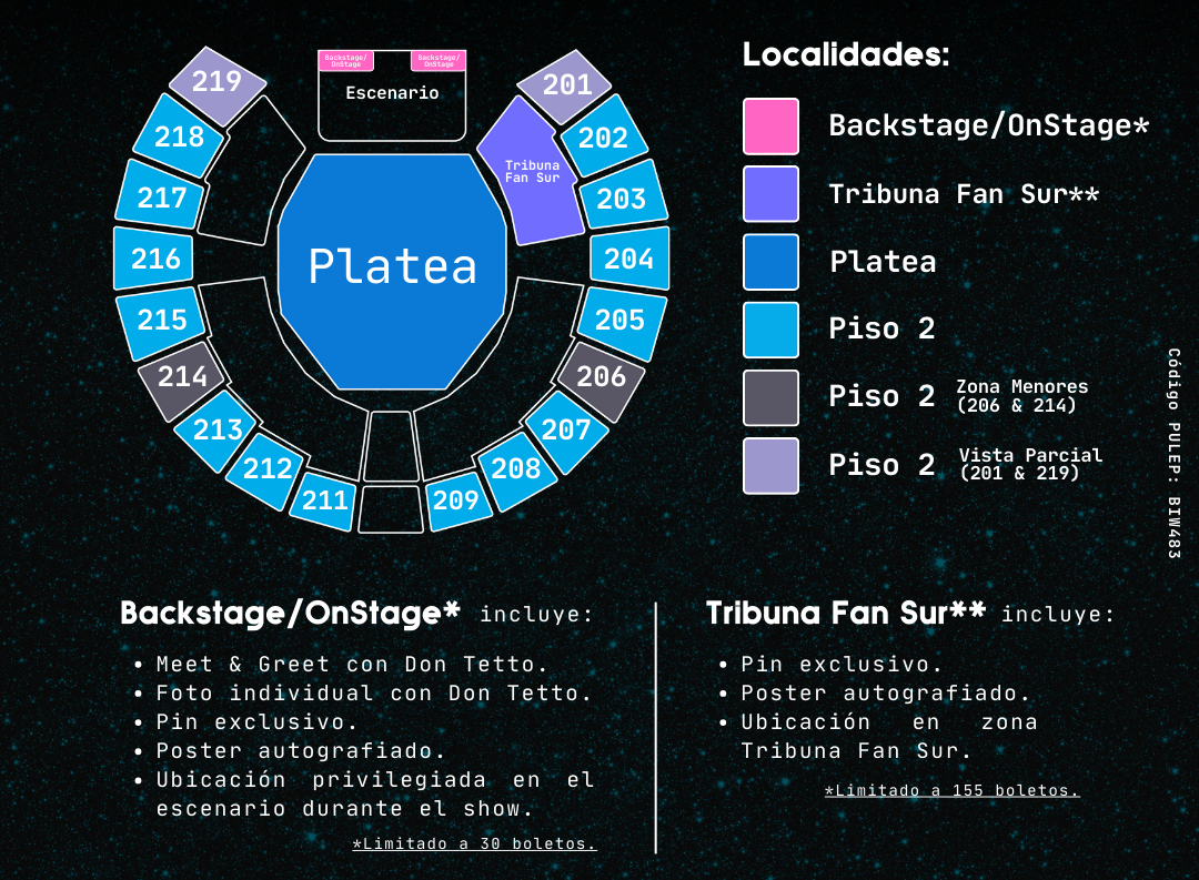 - Los sectores: 201, 219, 301 y 319 pueden tener restricciones de visibilidad dependiendo del montaje que se realice del espectáculo, pantallas, escenarios luces, sonido, etc, situación que reconoce y acepta en el momento de comprar las boletas. En los casos anteriores, no serán de recibo posteriores quejas o reclamaciones relacionadas con este aspecto, es decir con la visibilidad del espectáculo.