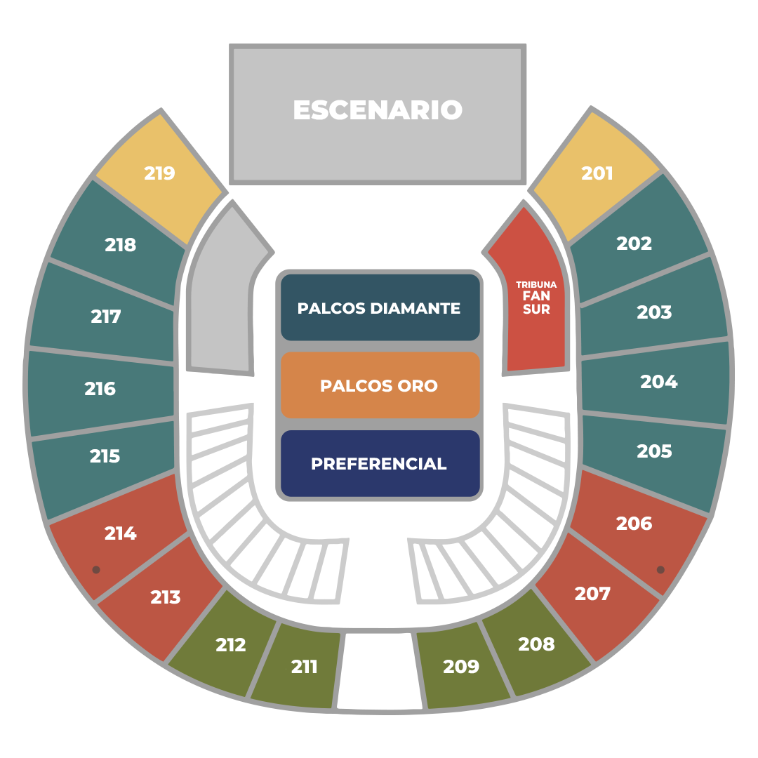 - Los sectores: 201, 219, 301 y 319 pueden tener restricciones de visibilidad dependiendo del montaje que se realice del espectáculo, pantallas, escenarios luces, sonido, etc, situación que reconoce y acepta en el momento de comprar las boletas. En los casos anteriores, no serán de recibo posteriores quejas o reclamaciones relacionadas con este aspecto, es decir con la visibilidad del espectáculo.