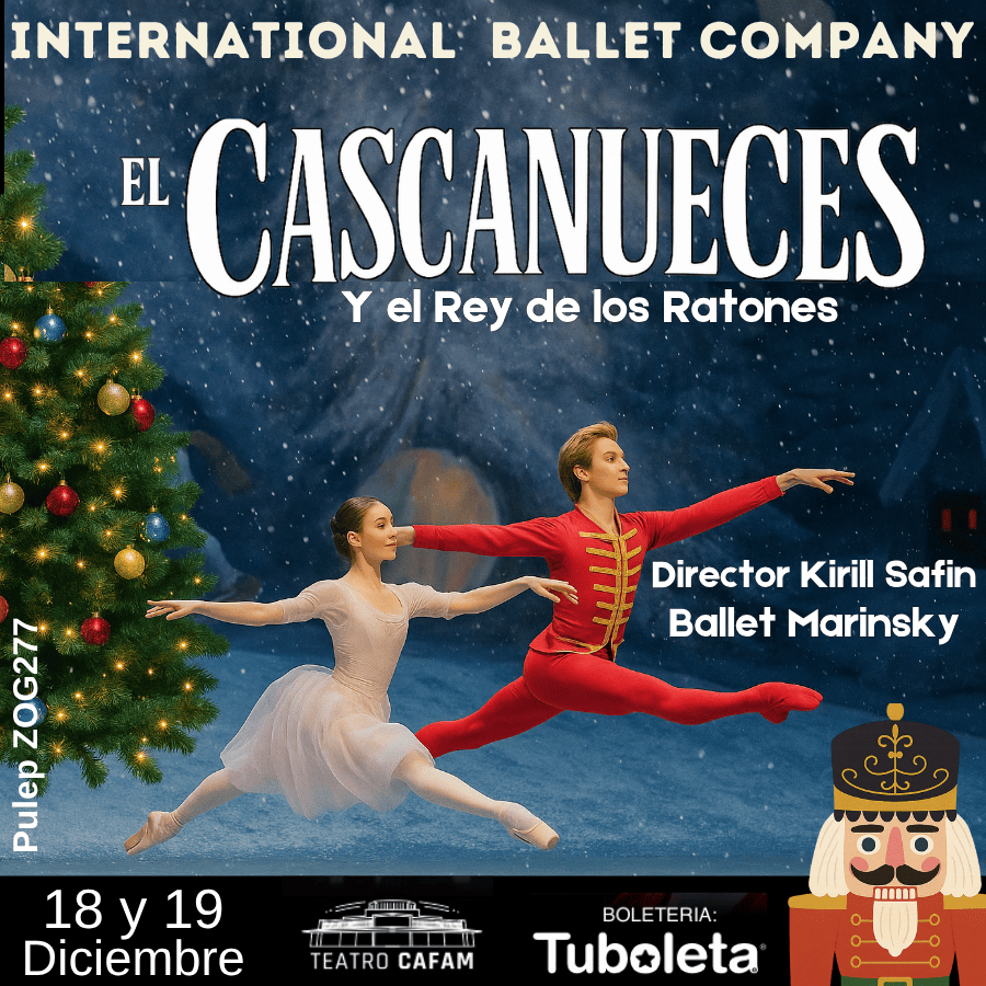 INTERNATIONAL BALLET COMPANY con artistas de Rusia, Francia, Ucrania, Irlanda, Japón, Italia, presenta en Bogotá para el disfrute de grandes y chicos "EL CASCANUECES", el clásico ballet de navidad basado en el cuento alemán de E.T.A Hoffmann, "El Cascanueces Y El Rey De Los Ratones", el cual narra la historia de clara, la niña que en sueños es conducida por un príncipe al país de las golosinas y visita muchos reinos encantados.