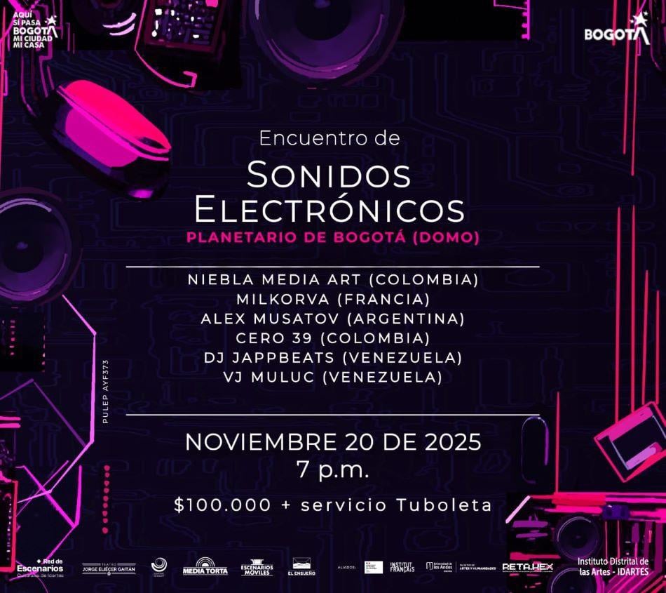 El Encuentro de Sonidos Electrónicos llega al domo del Planetario de Bogotá con una noche dedicada al arte digital y la música en vivo. Durante 5 horas, el público vivirá un viaje inmersivo donde el sonido y la imagen se fusionan en experiencias únicas. Con la participación de Niebla Media Art (COL), Milkorva (FRA), Alex Musatov (ARG), Cero 39 (COL), DJ Jappbeats (VEN) y VJ Muluc (VEN), la cúpula se transformará en un escenario sensorial que cruza música electrónica, visuales generativos y experimentación artística.