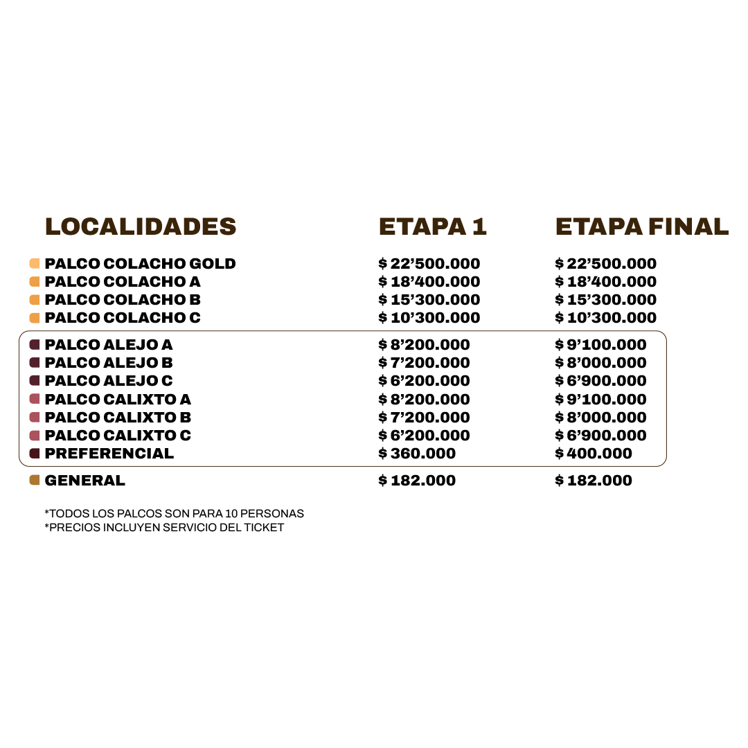 Solo las localidades Palco Alejo, Palco Calixto y Preferencial tienen precio con descueto en Etapa 1. Los precios pueden fluctuar en función a la oferta y la demanda.